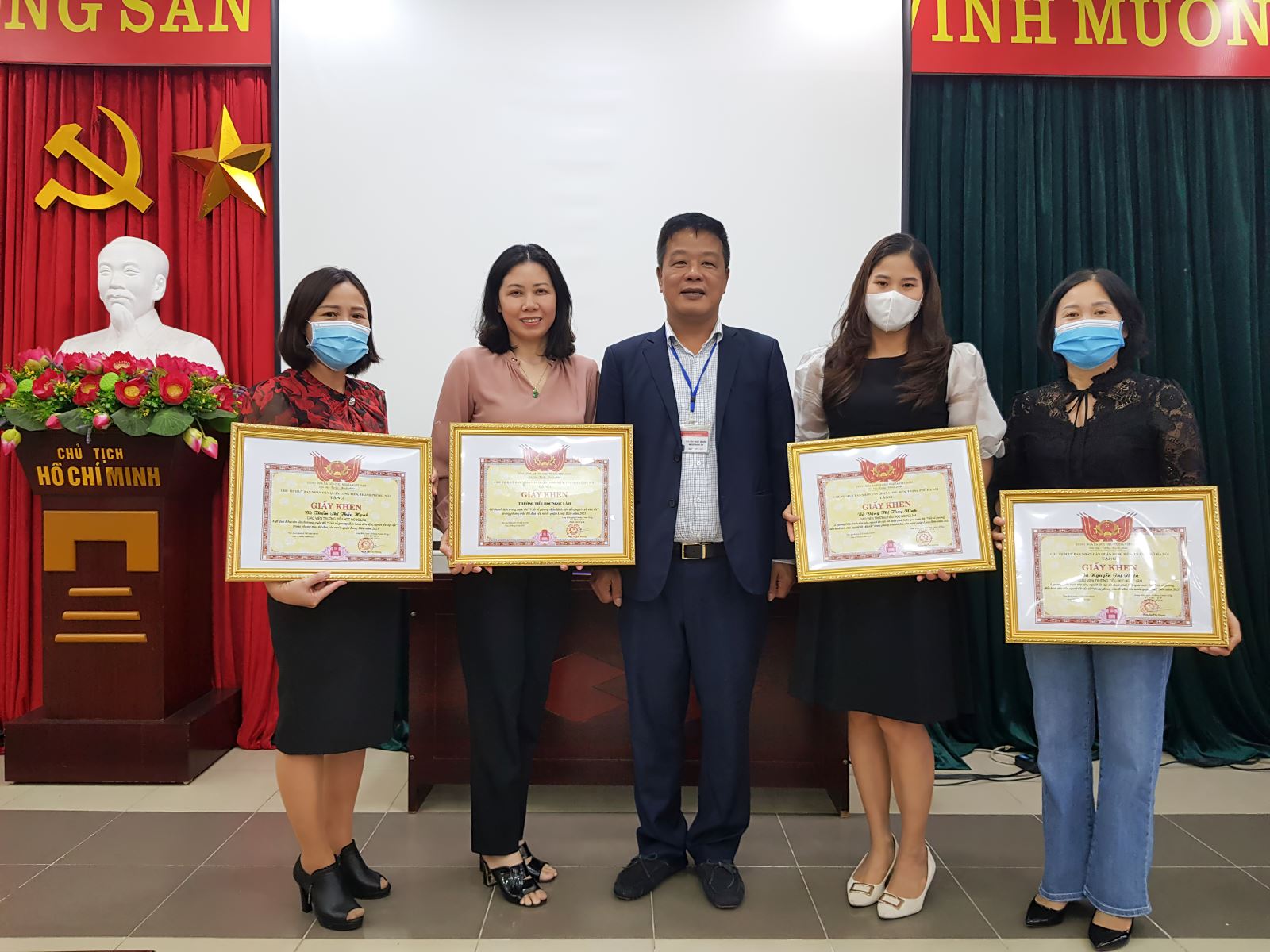 - Cô giáo Đặng Thị Thùy Ninh, cô Thẩm Thị Thúy Hạnh và cô Nguyễn Thị Thiện được khen thưởng tham gia hiệu quả cuộc thi viết về tấm gương điển hình tiên tiến, người tốt việc tốt của Quận Long Biên.